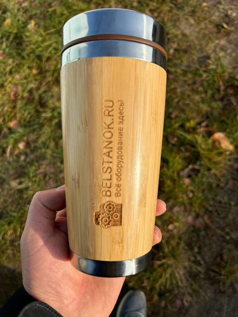 Термокружки с бамбуковым покрытием: Трендовое сочетание стали и дерева. Логотип на такой поверхности выглядит премиально и не стирается со временем.