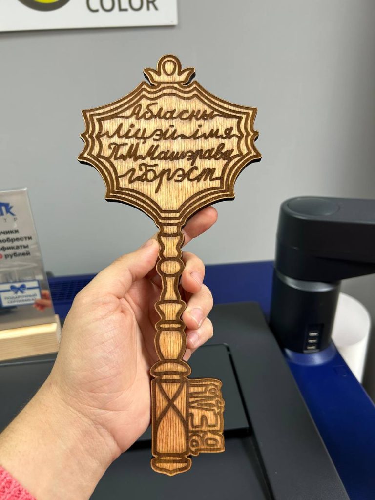 Эксклюзивные награды и сувениры: Сложные фигурные изделия из дерева (ключи, плакетки, медали) с детализированной прорисовкой шрифтов и мелких элементов.