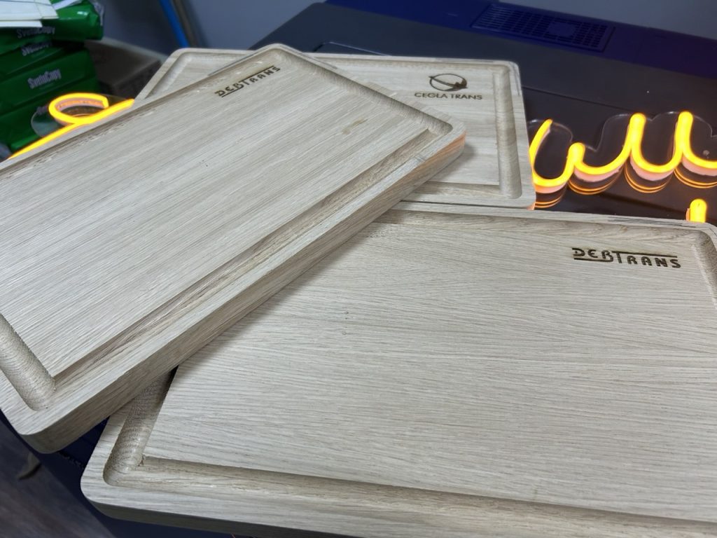 Эко-посуда и кухонные аксессуары: Разделочные доски из дуба или ясеня с глубокой гравировкой логотипа — идеальный подарок для сегмента HoReCa или корпоративных клиентов.