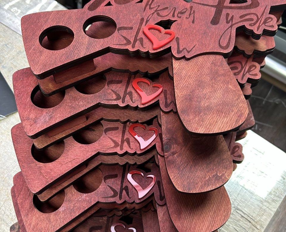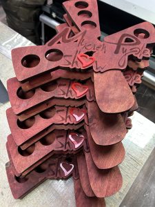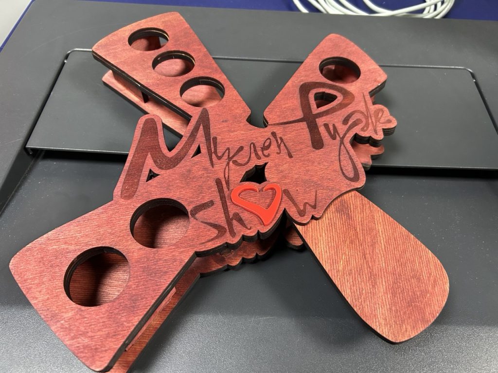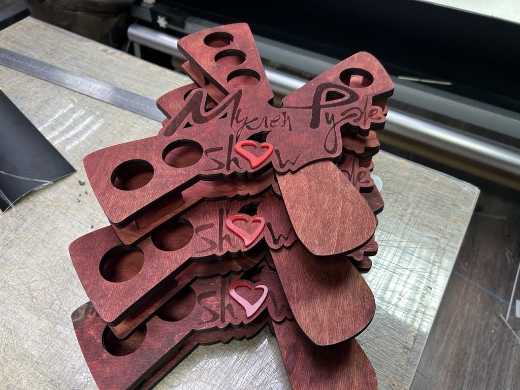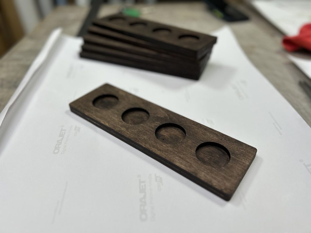 • Размер и форма: Изготовим шотницы на любое количество рюмок (от 2 до 6 и более), любой формы – от классических прямоугольных до фигурных, как наши «X-образные» варианты с сердечком.