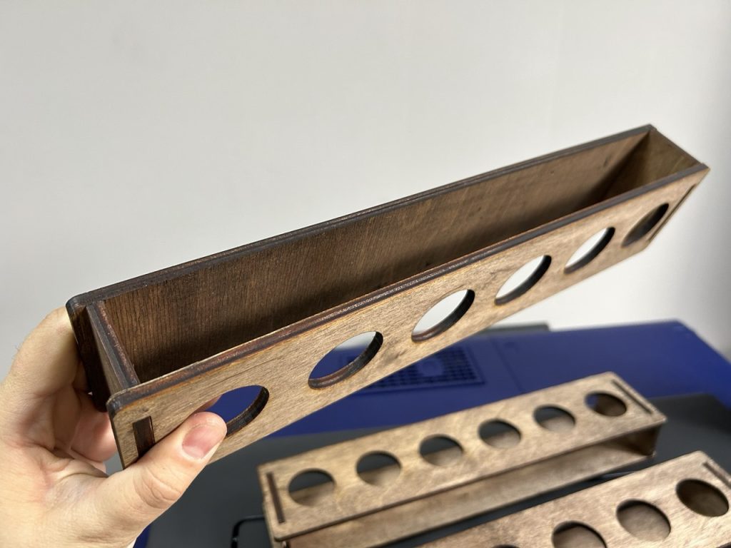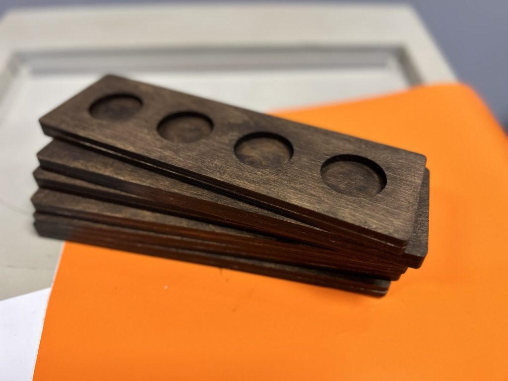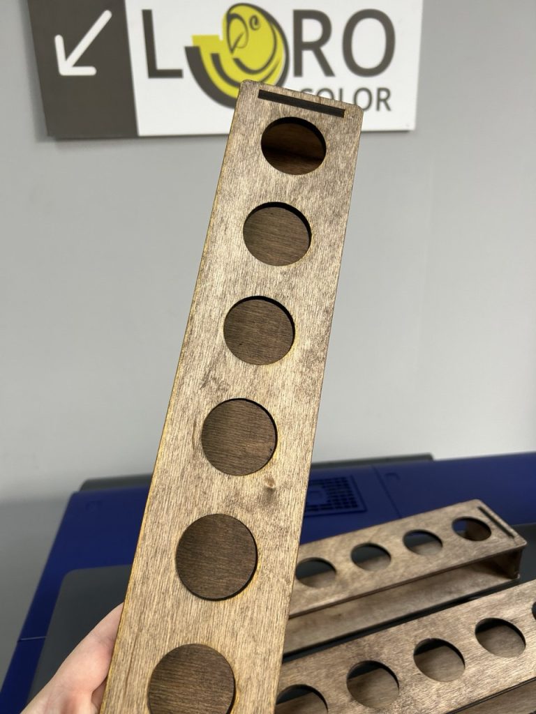 • Покраска и тонировка: Вы можете выбрать натуральный цвет фанеры (как светлые подставки на фото) или заказать покраску в любой оттенок, включая тонировку под ценные породы дерева (как насыщенно-красные шотницы).